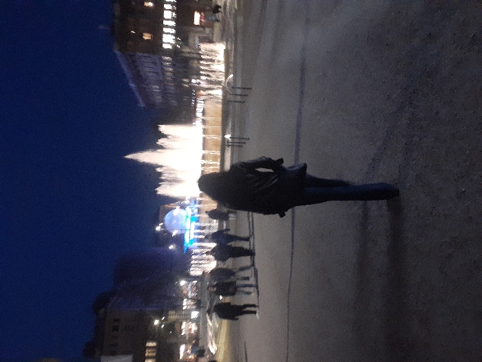 night scene in a city square. A fountain with illuminated water jets is the focal point, with buildings lit up in the background. Several people are walking in the square, their silhouettes visible. One person is more prominent, standing on the right side of the frame, facing the fountain. The sky is dark blue, contrasting with the bright lights of the city and the fountain. The ground appears to be paved, with a slightly grainy texture.