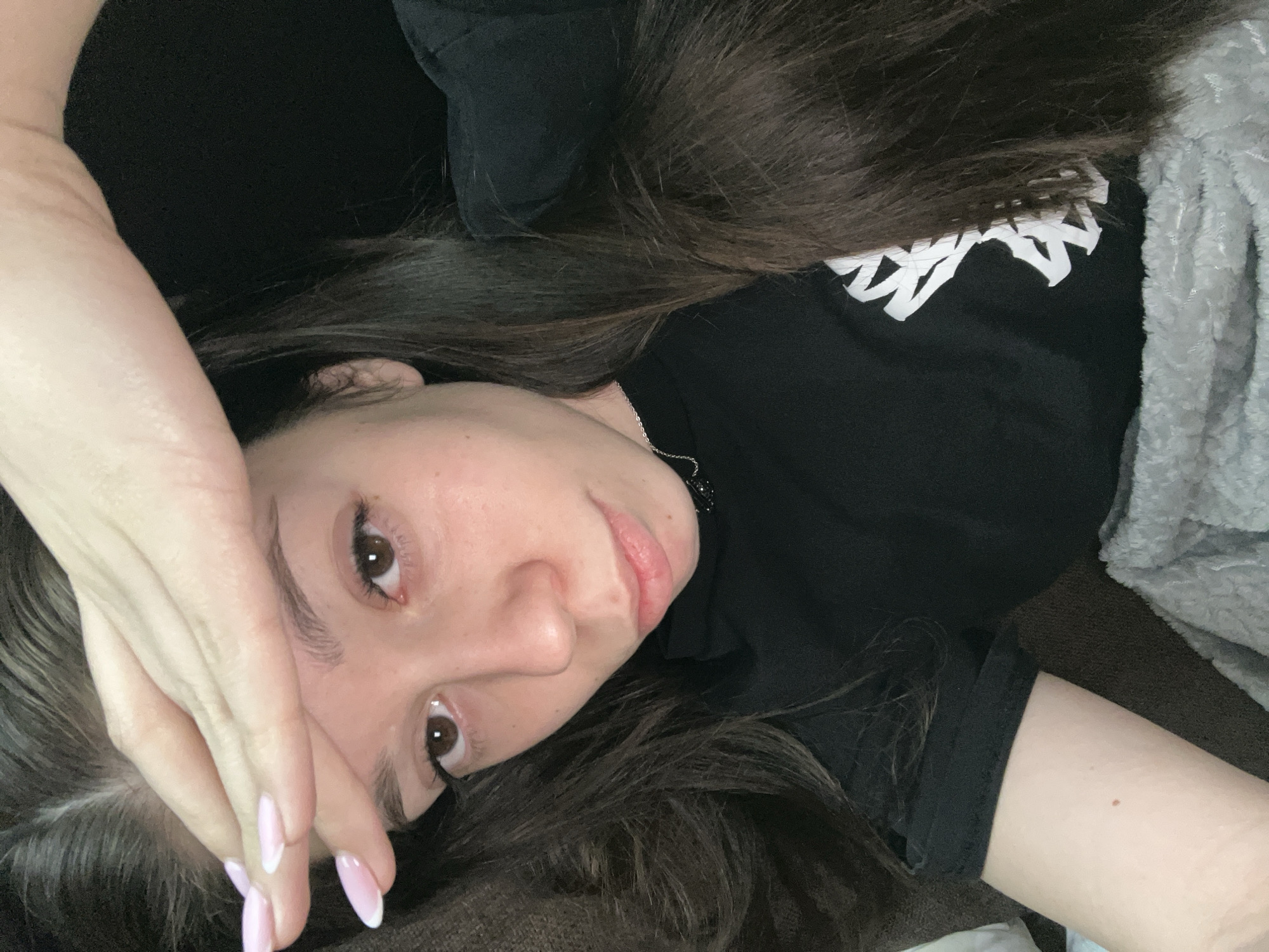 A young woman is lying down indoors. She has long brown hair and fair skin. She is wearing a black t-shirt with a white graphic on the chest. Her left hand is raised to her forehead. Her fingernails are painted light pink with white tips. The environment includes a grey fuzzy blanket and a dark brown surface, possibly a couch or bed. The location in Sofia, Bulgaria is not discernible from the image.