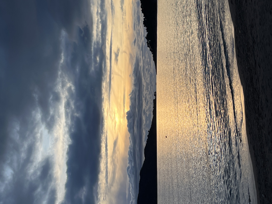 A tranquil scene of a body of water reflecting a dramatic sky. The sky is filled with dark, textured clouds alongside bright patches of sunlight. The water's surface shimmers with reflected light, creating vertical streaks. Silhouetted landforms are visible between the sky and water, adding depth. The overall mood is serene, capturing the transition between day and night.