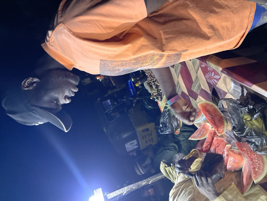 A man wearing an orange shirt and black baseball cap stands behind a cart. Slices of watermelon wrapped in plastic are displayed on the cart's surface, which features a geometric pattern. The man is likely selling the fruit at night, illuminated by a bright light. There is a variety of bottles and containers on the cart, along with a plastic milk crate. The lighting is dim, casting shadows on the surrounding area.