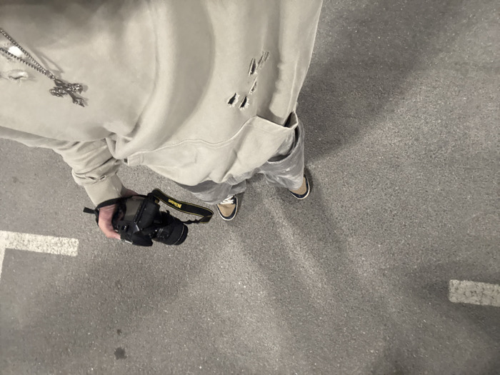 An overhead perspective captures an individual standing on a dark grey asphalt surface marked with white painted lines, typical of a paved area in Pazardzhik, Bulgaria. The subject wears a light beige hooded sweatshirt with multiple irregular distressed tears on the front, from which a silver-colored cross pendant on a chain is visible. Light grey, possibly velvet or velour, trousers and multi-toned sneakers with beige and dark sections are worn. A black Nikon camera with a yellow-lettered strap is held in the subject's right hand. No other individuals or specific environmental structures are discernible. The scene is illuminated by diffuse light.