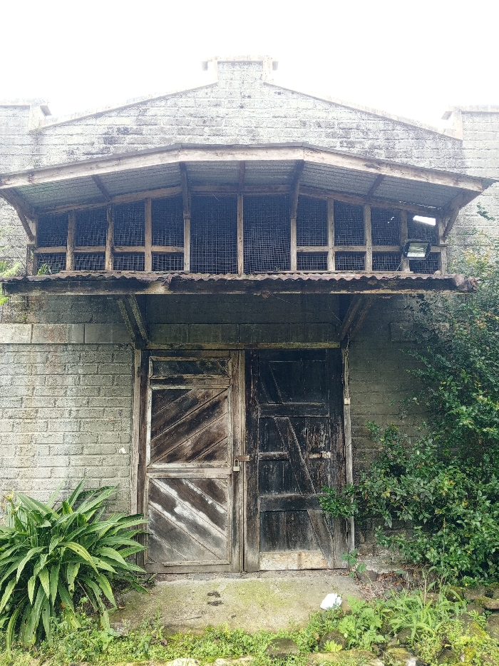 This image displays the weathered facade of a two-story building in Pacet, Indonesia. The structure is constructed from light grey cinder blocks. The upper section features a pitched brickwork gable. Directly below this, an enclosed, elevated area spans the facade, sheltered by a corrugated metal awning supported by a wooden frame. This upper enclosure contains multiple window openings, each fitted with a metal mesh or grill. A dark, rectangular floodlight is mounted on the exterior wall to the right within this elevated section. At ground level, two heavily weathered wooden doors are visible. The left door, composed of light brown planks arranged diagonally, is secured by a padlock on its right side. The adjacent right door is darker brown, also featuring diagonal planking. A concrete slab forms the immediate ground in front of the doors. A piece of white debris, possibly plastic or paper, rests on this concrete near the right door. Green vegetation surrounds the base of the building. A large plant with broad, pointed green leaves grows to the left of the doors. On the right, a dense, leafy green bush stands against the wall. Grass and weeds are present on the concrete slab and the surrounding ground. No individuals or actions are depicted in the scene.