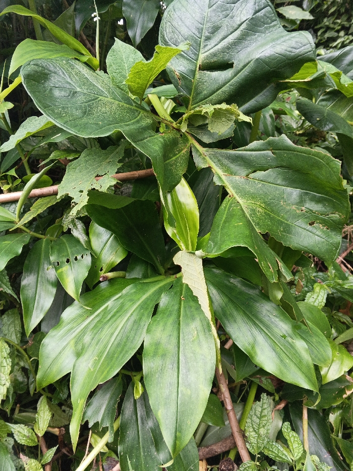 The image displays a close-up view of dense tropical foliage within the city of Makilala, Philippines. The scene is dominated by various shades of green plant life. Prominently featured are large, broad, dark green leaves, some exhibiting irregular shapes, serrated edges, and multiple perforations indicative of insect damage. A distinct, elongated leaf in the upper-center shows significant marginal damage and a mottled, lighter green discoloration. Below these, several bright to medium green, lanceolate leaves with prominent veins are visible, some displaying faint vertical striations and small, circular holes. Brownish-green stems and branches crisscross the frame, with a notable light brown, straight stem running diagonally from the mid-left towards the upper-center. Smaller, textured green leaves are visible in the lower right corner, blending into the surrounding dense vegetation. No human subjects, animals, or artificial objects are present.