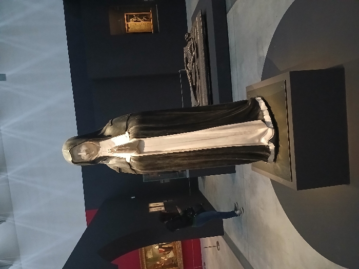 This image depicts the interior of the Louvre-Lens Museum in Lens, France, specifically a gallery exhibiting various artworks. **Central Subject:** A full-length, bicolour stone statue of a female religious figure stands prominently in the foreground. The figure wears a dark hooded cloak and habit over a white inner garment, with white hands clasped in prayer and a white face. This statue is elevated on a dark rectangular pedestal, positioned on a dark circular mat atop a light gray floor. **Background Elements:** * To the mid-right, another artwork is visible: a dark, recumbent effigy, possibly a tomb sculpture depicting a skeletal figure, displayed on a dark elevated platform. * To the far left, through a dark arched opening, a multi-figure painting hangs on a red-accented wall section. * To the far right, a small, illuminated golden or metallic artwork is recessed within a dark wall. **Individuals:** One individual is partially visible in the mid-left background, from the waist down. The person is wearing blue jeans and dark sneakers and appears to be holding a camera or smartphone, pointed towards an exhibit. **Environment:** The museum gallery features dark gray or black walls, a light gray floor, and a white ceiling with visible spotlights casting diagonal light patterns. The lighting is directional, highlighting the displayed artworks.
