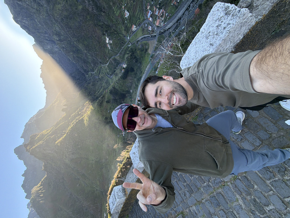 Two adult males are depicted in a selfie, positioned on a paved, elevated viewpoint overlooking a deep, mountainous valley in Ribeira Brava, Portugal