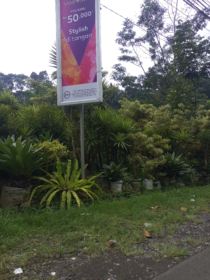 A roadside view displays a lush landscape with diverse plants and trees under an overcast sky. A tall sign featuring the text "POD BARU Rp 50.000 Stylish di tangan" stands prominently. Below, a variety of plants, including ferns and potted greenery, are arranged. The foreground is dominated by green grass growing on the roadside.