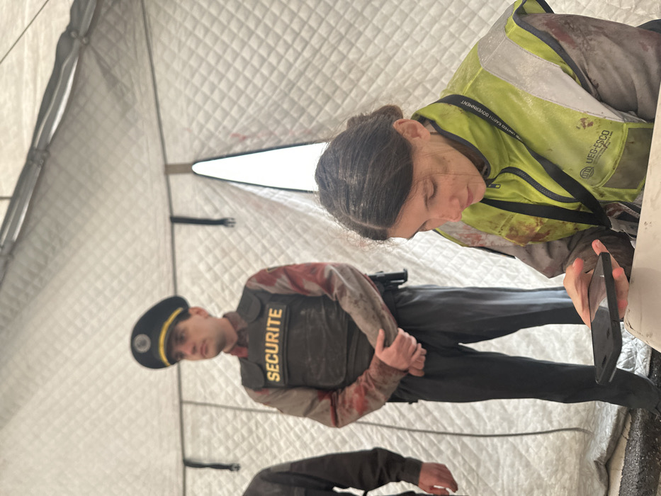 Within a white, quilted tent structure in Huangdao District, China, a forensic scene unfolds. In the foreground right, a female individual, likely an adult, is seated and focused on a black smartphone held in her hands. Her dark hair and face show smudges of dirt and debris. She wears a light-colored long-sleeved shirt beneath a bright yellow-green high-visibility vest with reflective strips. The vest displays the logo "UEG-ESCO" and the text "UNITED EARTH GOVERNMENT". Both her shirt and vest are extensively stained with reddish-brown substances consistent with dried blood, particularly on the sleeves and upper torso. To her left, in the mid-ground, a male individual, an adult, stands upright with his hands clasped in front of him. He is dressed in a dark uniform consisting of dark trousers, a greyish-brown long-sleeved shirt, and a black tactical vest emblazoned with "SECURITE" in yellow capital letters across the chest. He wears a dark peaked cap with a gold band and an emblem. Similar to the female, his shirt sleeves exhibit significant reddish-brown staining. A dark utility item or holster is visible on his right hip. His gaze is directed slightly to his right. A partial view of another individual in dark attire is visible on the far left. The background reveals a bright, triangular opening in the tent wall.