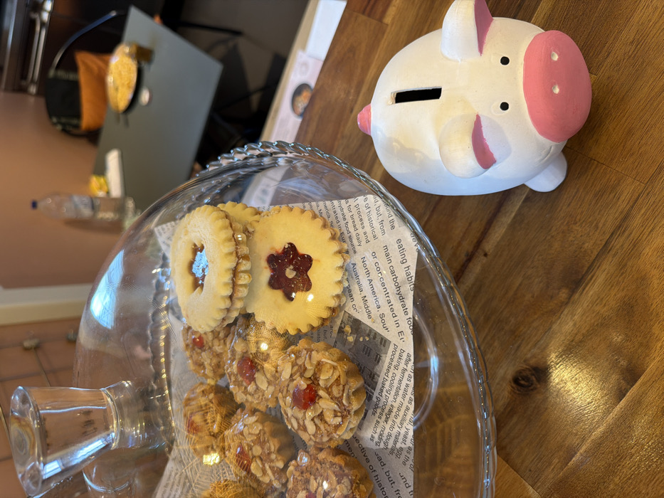 The image displays an indoor scene in Villecresnes, France, focusing on a wooden surface that holds a glass cake stand and a ceramic piggy bank. On the left, a multi-tiered clear glass cake stand, covered by a glass dome, contains an assortment of baked goods. Approximately ten small, round tarts topped with almond slivers and a single red berry or cherry are individually wrapped in clear plastic. Stacked next to these are three shortbread-style cookies with scalloped edges; the top two feature a circular cutout, while the bottom cookie has a flower-shaped cutout, all revealing a red jam filling. The pastries are arranged on a liner made from newspaper-like paper with visible English text. To the right of the cake stand, a white ceramic piggy bank with pink ears, a pink snout, and small black eyes rests on the wooden surface, exhibiting a coin slot on its back. The wooden surface shows a distinct grain pattern and reflections. In the background, a light orange-brown wall is visible on the left. On the right, a dark gray table is partially visible, accompanied by a chair with a black frame and an orange cushion. A clear plastic water bottle, some light-colored papers or objects, a dark container, and a round yellow item (possibly a snack in a bag) are present on the table. The far background appears dark, suggesting an interior wall or furniture. No people are visible.