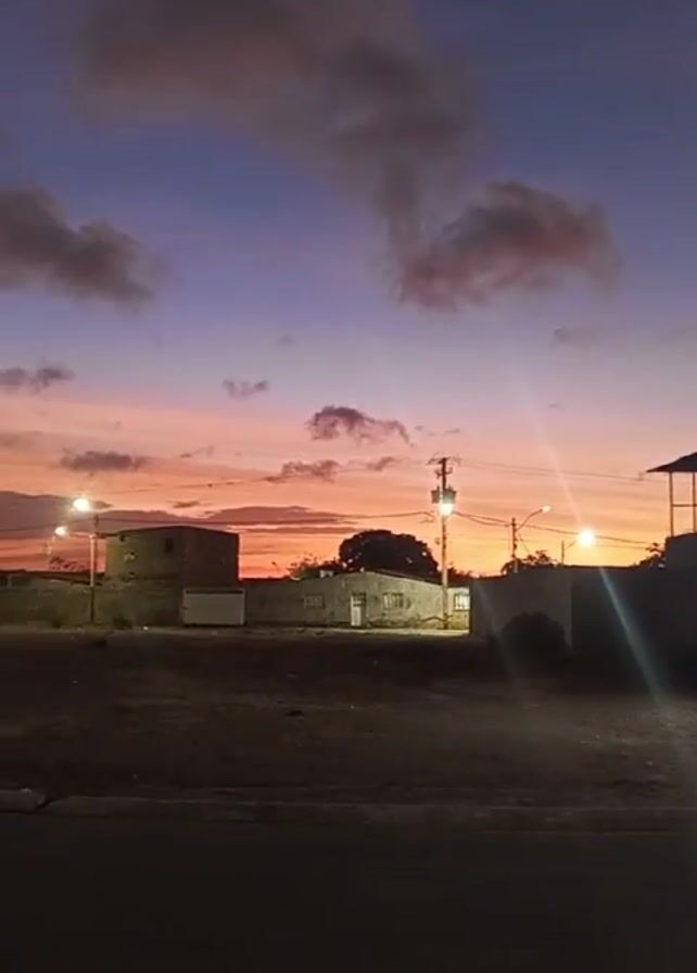dusk or dawn scene with a colorful sky of purple, pink, and orange. There are scattered clouds overhead. In the distance, there are a few low buildings and utility poles with streetlights that are illuminated. The foreground is a dark, paved area, possibly a street or road. A person walks into the frame and away from the camera. The video is labeled "TECNO SPARK 20c" at the bottom.