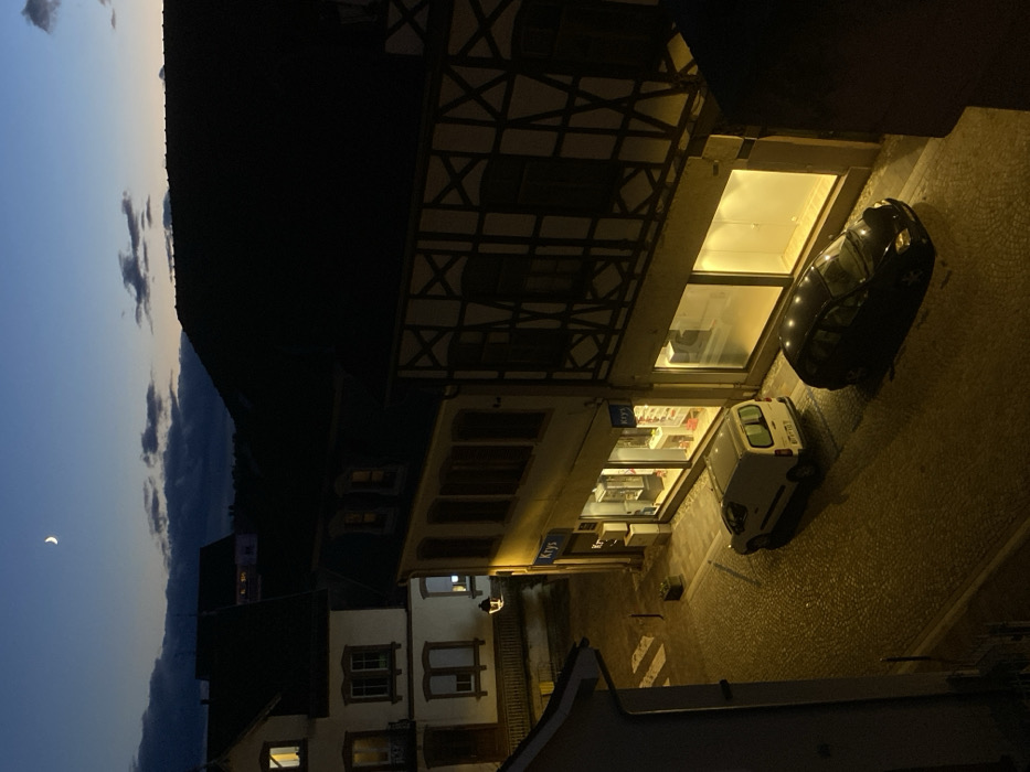 The image depicts a nighttime street scene in Erstein, France, viewed from an elevated position. The sky is dark blue with scattered dark clouds and features a thin crescent moon in the upper left quadrant. Artificial warm yellow light illuminates the cobblestone street and several buildings. On the left, a multi-story residential building, light-colored with dark window frames and a small balcony, shows one upper-floor window illuminated. Below it, a traditional wall-mounted lantern provides additional light. In the center, a commercial building houses a "Krys" optical store on its brightly lit ground floor, displaying merchandise. The upper floors of this building appear dark with closed shutters. To the right, an older, half-timbered building features dark wooden beams in a criss-cross pattern. Its ground floor contains two large, brightly lit display windows, which appear empty or minimally furnished. Two vehicles are parked on the cobblestone street. A white panel van, with its rear facing the viewer, is positioned on the left side of the street, partially illuminated by shop lights. A dark-colored hatchback car is parked on the right side of the street, closer to the foreground, facing towards the viewer and mostly in shadow. No individuals are visible in the scene. The overall impression is a quiet, well-lit urban street after dusk.