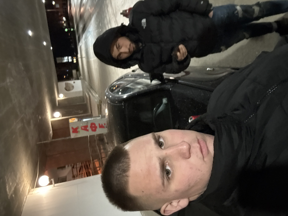 The image depicts two males in an illuminated, semi-covered outdoor area at night in Stara Zagora, Bulgaria