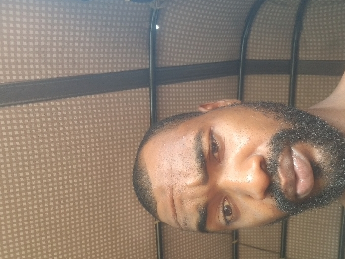 close-up of a man's face. He has short, dark, curly hair and a thick, dark beard. He is looking directly at the camera with a slightly furrowed brow. He has dark eyes and a dark complexion. The background is blurred and appears to be a brown, woven material. The image was likely taken indoors. The coordinates provided, 7.802 latitude and 6.687 longitude, correspond to a location in Adonkolo, Nigeria, but do not provide any additional contextual information about the image.