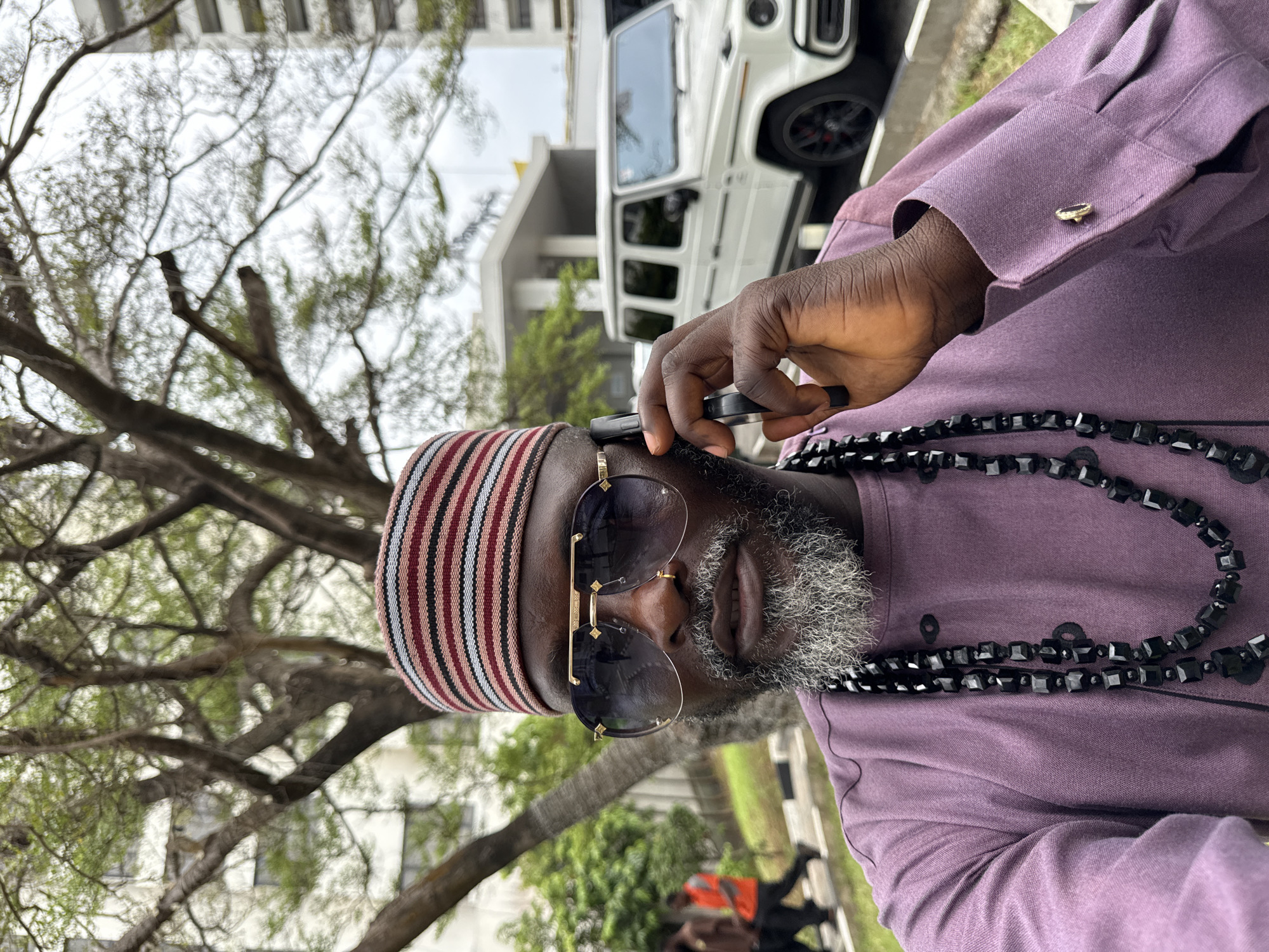 An adult male with dark skin, a prominent graying beard, and a gold nose ring is depicted in a close-up, likely selfie-style, outdoor photograph. He wears large, gold-framed sunglasses with dark lenses and a traditional striped cap featuring horizontal bands of red, black, and light gray/white. His attire includes a purple long-sleeved garment with a structured collar and French cuffs secured by a gold cufflink. A multi-strand black beaded necklace, appearing faceted or square, hangs around his neck. He holds a black smartphone to his left ear with his left hand, suggesting he is engaged in a phone call or posing while on a call. The background, partially blurred, reveals an urban or semi-urban environment. To the left, two figures are visible walking on a paved sidewalk bordered by a low concrete curb and a grassy area. One figure wears an orange high-visibility vest over a dark shirt. To the right, a white Mercedes-Benz G-Wagen SUV is partially visible, appearing parked or moving slowly on a paved surface. Behind the vehicle, a modern building with a distinct white, flat-roofed architectural design is present, with another taller, multi-story building further in the distance. Mature trees with green foliage and visible branches are scattered throughout the scene. The sky is overcast. No specific visual cues within the image definitively confirm the location as Itirin, Nigeria.