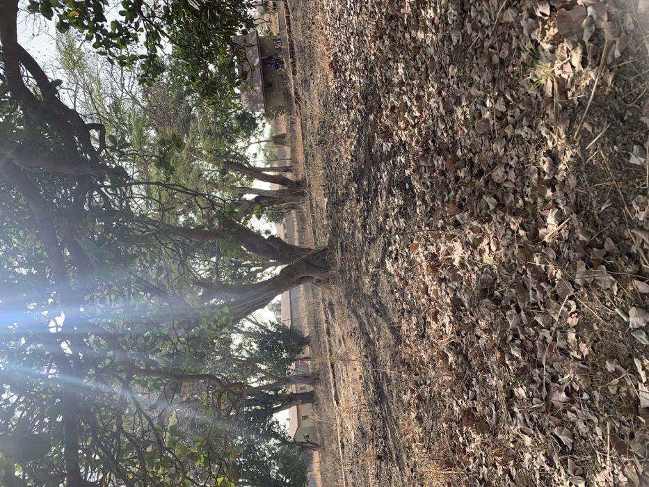 This image depicts an outdoor, semi-rural scene in Bukuru, Nigeria, under bright sunlight. The foreground and midground consist of dry, dusty ground heavily covered with fallen, brown leaves and sparse dry grass. Patches of dark, scorched earth are visible, suggesting recent burning. Numerous trees with visible trunks and branches, some retaining green foliage, are scattered across the landscape, casting elongated shadows. Prominent sun rays filter through the upper canopy of the trees in the foreground. In the mid-distance on the left, a series of low-rise buildings with light-colored walls and dark roofs are visible. To the right, a smaller, rustic dwelling with a light-colored, possibly thatched or corrugated metal roof, stands. Two indistinct human figures are discernible in the shade directly in front of this smaller dwelling, appearing to be seated or standing. The overall environment suggests dry season conditions.
