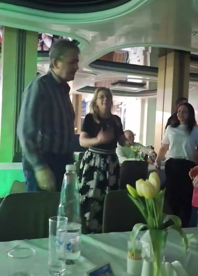 Several people are dancing in what appears to be a restaurant or event space. There are tables set with white linens, glasses, water bottles, and small bouquets of yellow tulips. The man in the foreground is wearing a blue striped shirt and jeans. A woman in a black top and black-and-white patterned skirt is dancing beside him. Other people are dancing in the background. The space has a mirrored ceiling and pillars. The lighting changes from neutral to blue.