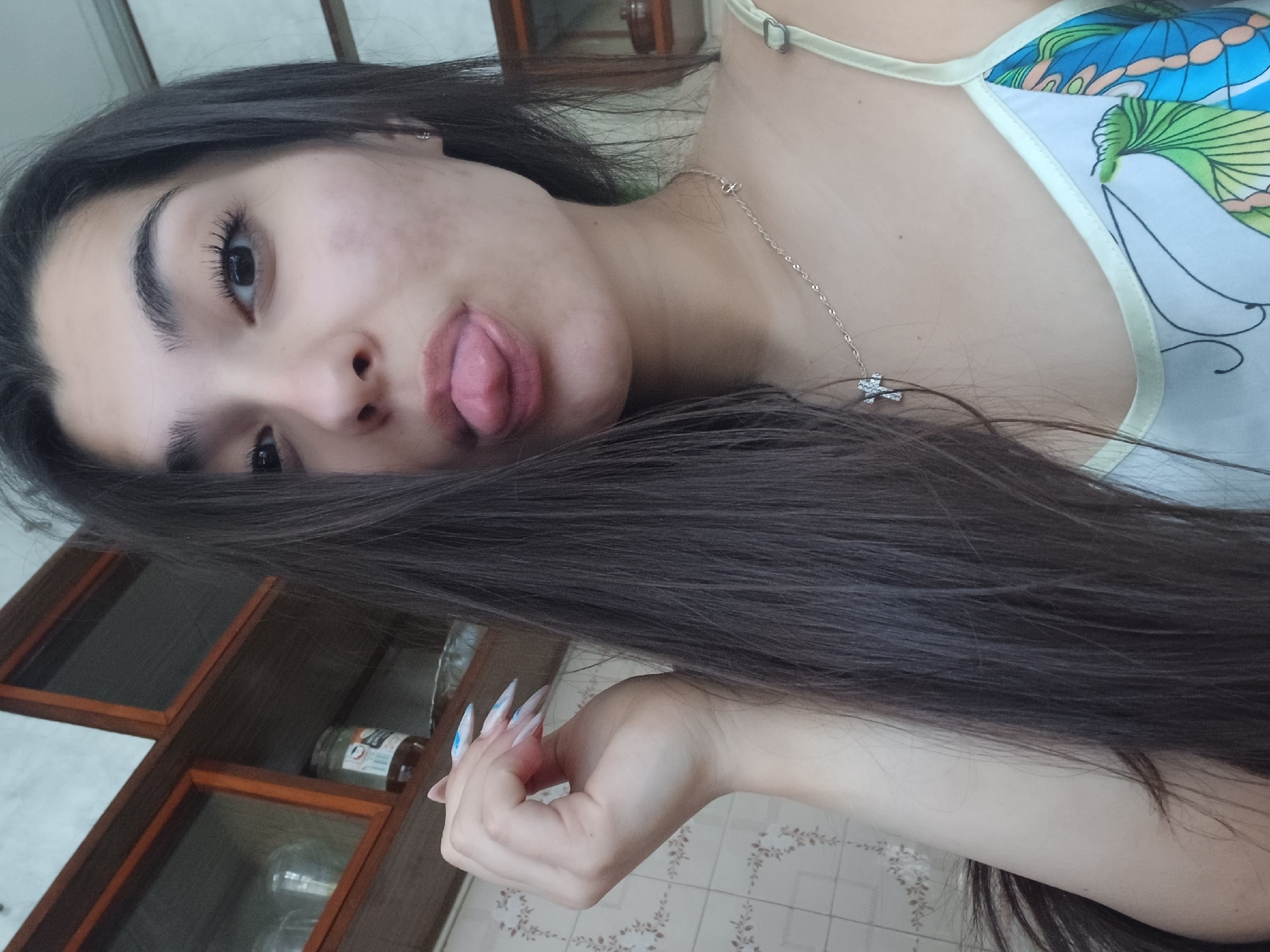 A young woman is photographed from an overhead perspective, with her head angled. She has dark hair and fair skin, and she is sticking her tongue out. She is wearing a necklace and a patterned top. Her left hand is visible with long, decorative nails. In the background, a glass-doored cabinet and tiled flooring can be seen. The location is unknown.