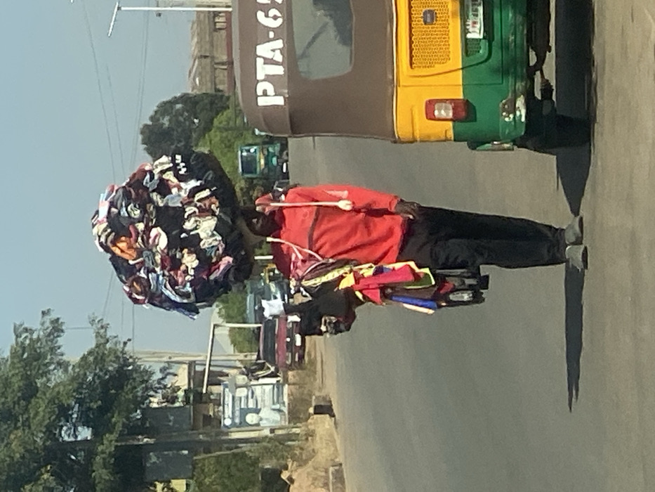 The image displays a daytime street scene within the city of Jos, Nigeria. In the center-left foreground, a male individual is depicted, wearing a red long-sleeved hooded top, black trousers, and grey slip-on shoes. He is carrying a large, spherical bundle of assorted multicolored clothing on his head, and additional colorful fabrics and a dark bag are slung over his left shoulder. His shadow is cast to his right. To the immediate right of the individual, in the foreground, is the rear section of an auto-rickshaw (Keke Napep) featuring a brown canopy, yellow upper body, and green lower body. The text "PTA-65" is visible in white on the brown canopy. The scene takes place on a paved asphalt road. In the mid-ground on the left side of the road, a red sedan is partially visible. Further in the background, to the right, a green commercial vehicle (possibly a truck or bus) is present. The left side of the road is lined with green trees, behind which a utility pole and a billboard structure with a blue poster depicting a white figure are visible. The sky is clear blue, and various urban buildings are discernible in the distant background.