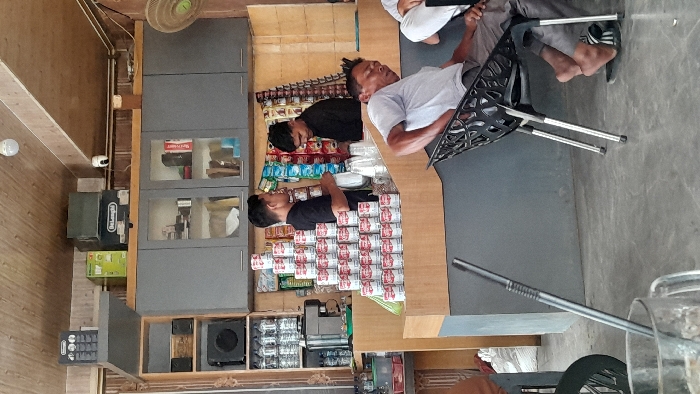 The interior of a convenience store is shown. A gray cabinet with glass doors is on the left. Below it are shelves, a speaker, and a cash register. At the counter, two men are standing behind a pyramid of canned goods. One man is wearing a black shirt, while the other has a white one. There are two men sitting on chairs in the upper right corner. A steel straw is in the foreground.