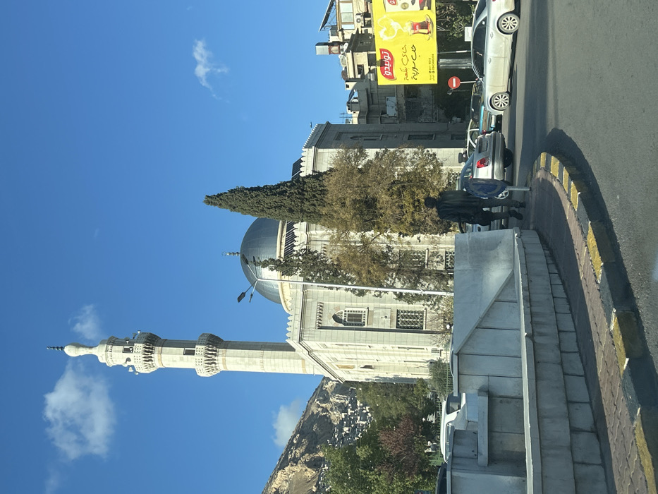 The image depicts an urban street scene in Al-Muhajerin Municipality, Syria, under a clear blue sky with minimal cloud cover. The central subject is a large mosque constructed from light-colored stone, featuring a tall, slender minaret with multiple balconies and a pointed finial on its left side, and a prominent dark, metallic dome in the center. The mosque building exhibits arched windows and decorative architectural elements. To the far left and in the background, a rocky, barren mountain range is visible, with numerous small, light-colored structures scattered across its slopes. Various trees are present in the midground, including several tall, dark green coniferous trees positioned near the mosque, and deciduous trees with sparse, autumn-colored foliage. In the immediate foreground, a multi-tiered concrete barrier or planter runs along the bottom and left. To its right, a paved street or road is visible, bordered by a curb painted with yellow and black stripes. One individual, seen from behind, walks on the sidewalk adjacent to the street, wearing dark clothing and appearing to carry an object in their left hand. Multiple vehicles, including various sedans, are present on the street; some are parked, while others appear to be in transit. On the far right, a large yellow billboard displaying Arabic text and an image of a teacup is prominent, along with a circular red 'no entry' sign. A tall, dark street light pole with two luminaires is situated between the mosque and the street.