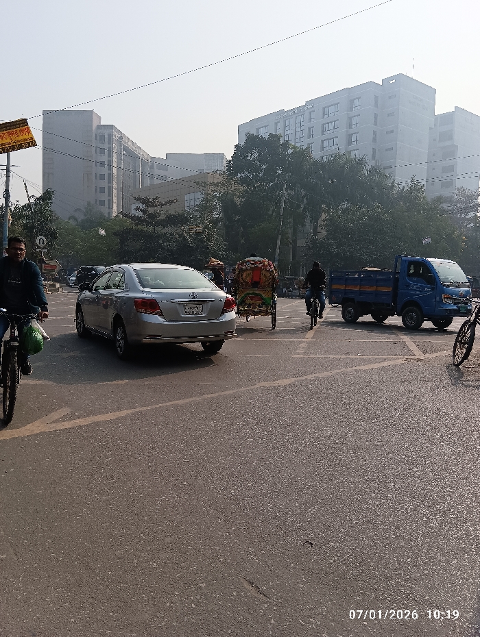 A cityscape under a hazy sky shows a street scene. A silver car dominates the immediate view, followed by a colorful rickshaw. Two cyclists and a small blue truck are also present. Buildings stand in the background, partially obscured by trees. A sign is visible on the left side, and the date 07/01/2026 is at the bottom.