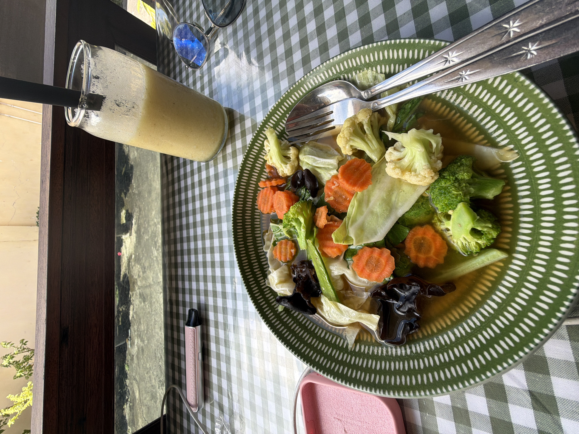 table setting, likely in a restaurant or cafe. The table is covered with a green and white checkered tablecloth. On the table is a plate of stir-fried vegetables including broccoli, cauliflower, carrots, cabbage, and what appear to be wood ear mushrooms, along with a spoon and fork. Next to the plate is a glass of a yellow smoothie with a black straw. A pair of glasses rests on the table as well. A pink vape pen is also present. The view from the window suggests the image may have been taken in a location with greenery outside. The description requests that the location be identified as Ungasan, Indonesia.