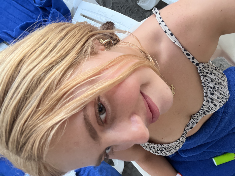 - "A woman with light blonde hair and fair skin is seen close up, wearing a bikini top with a black and white speckled print" by FM-VYYYD2, licensed under CC BY 4.0