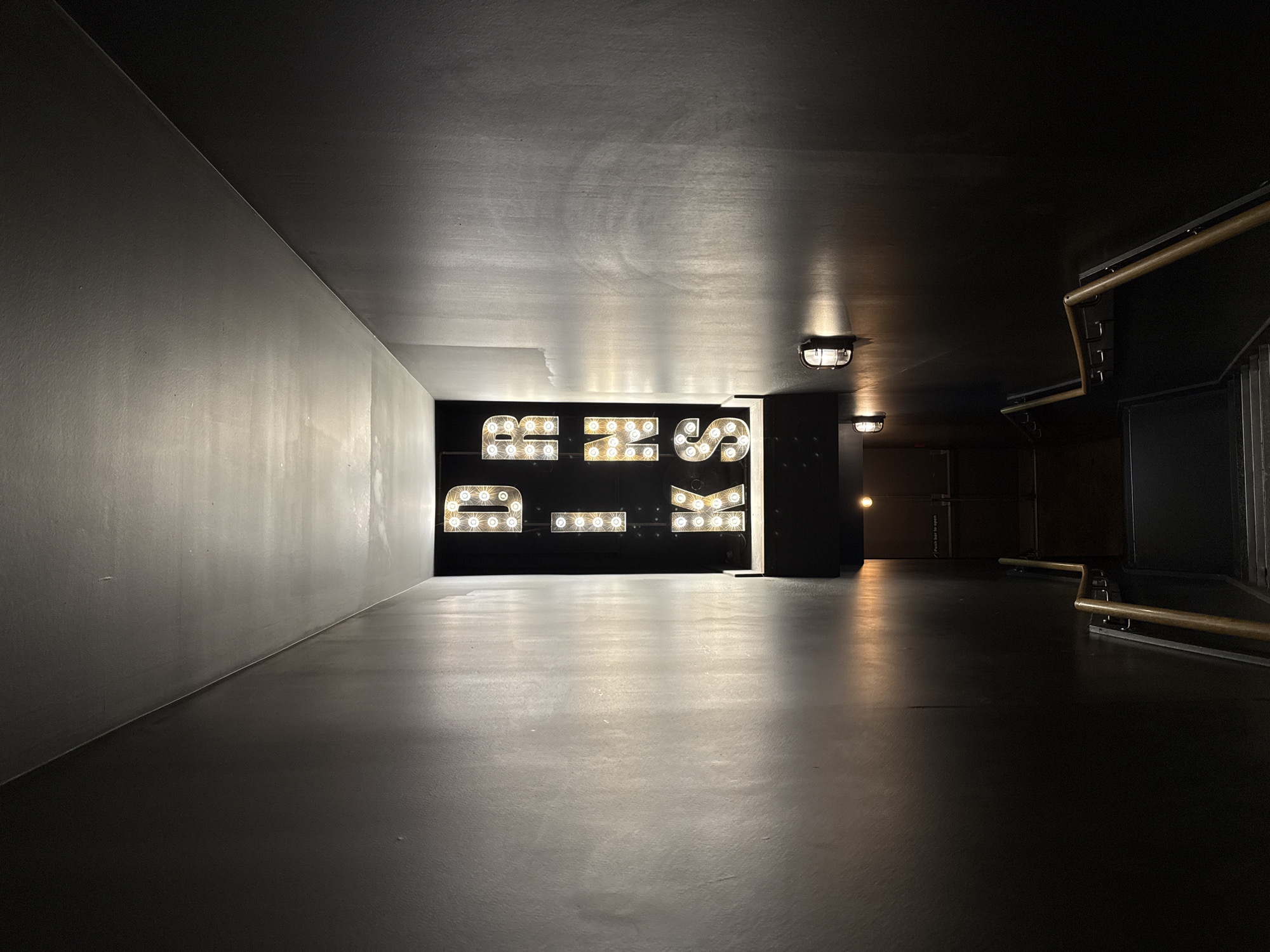 The image depicts the interior of a dimly lit space in Ipswich, United Kingdom. A black wall features illuminated marquee letters spelling "BESPOKE". Two rows of letters are visible. The space has gray walls and floor with overhead lights. The right side of the image shows a staircase with a wooden railing.