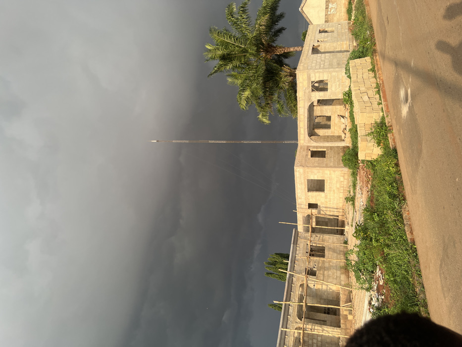 partially constructed brick building with a tall radio tower in the background. There is a palm tree to the right of the building and a small patch of green vegetation in front of it. The building is constructed with concrete blocks and is not finished. The sky is dark and cloudy with a slight hint of sunlight. The image was taken in Ita Oniyan, Nigeria at coordinates 7.303, 5.155.