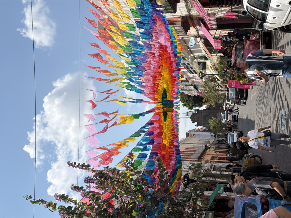 The image captures a vibrant street scene on Calle 6 Oriente in Puebla, Mexico, with the distinctive Puente de Ovando archway visible in the distant background. Overhead, hundreds of brightly colored "papel picado" flags, arranged in a rainbow spectrum from pinks and reds to blues and purples, are strung across the street, creating an arching canopy. The sky is clear blue with scattered white cumulus clouds, and bright sunlight casts distinct shadows. The street is paved and lined with multi-story colonial-style buildings featuring balconies and facades painted in varying pastel and vivid hues, including pink, white, red, and yellow. Ground-level storefronts display awnings, with a green one visible on the left and a pink one on the right, alongside various business signs, including a red sign for a "BUFFET DE TACOS $99." A flowering tree with pink and purple blossoms is prominent on the left side of the foreground. Approximately 15-20 individuals, primarily adults, are visible walking on the street. In the foreground-left, a man in a dark grey polo shirt stands next to a partially visible blue car, near a young man in a black t-shirt. In the mid-ground-left, a woman in a white graphic t-shirt and grey pants walks towards the viewer. In the mid-ground-right, a man in a blue and white striped t-shirt holding a small, light-colored object walks towards the viewer. Vehicles present include a partially visible blue car (foreground left), a partially visible white car (foreground right), a maroon Volkswagen Beetle (mid-ground right), and multiple other cars and a white pickup truck in the background, either parked or in slow motion. Streetlights with decorative poles are interspersed along the thoroughfare.