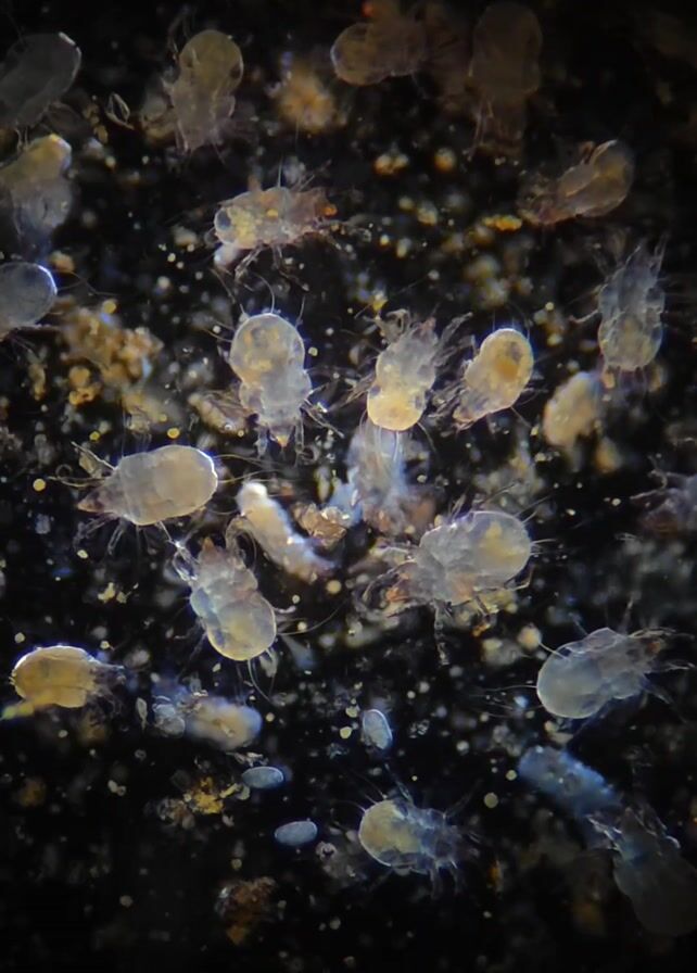 close-up view of many mites on a dark surface. The mites are translucent, with a yellowish tint, and have numerous legs. They are moving and interacting with each other and the surrounding debris. The background appears to be a dark, possibly organic material.