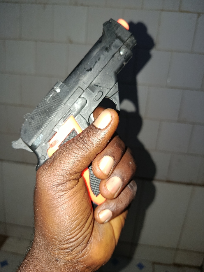 A dark-skinned hand grips a black and orange toy gun. The gun has an orange tip, suggesting it is a replica. The hand is positioned to suggest the gun is being held up and aimed. The background consists of tiles on a wall.