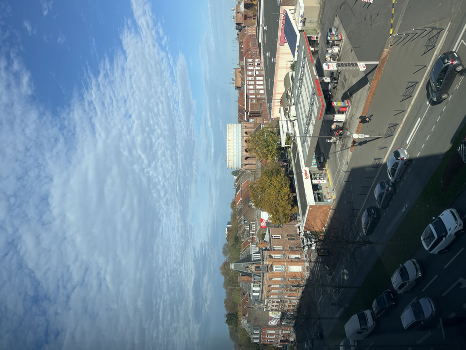 This image presents an elevated view of a city street and its surroundings in Roubaix, France, specifically depicting the area around Avenue Gustave Delory and the Château d'eau de Barbieux. In the foreground, a multi-lane road runs horizontally across the frame. Vehicles are present in both lanes; a white SUV, a silver hatchback, and a dark sedan are visible in the rightmost lane, while a white van, a dark sedan, and another silver hatchback are in the left lane, partially obscured by a dark foreground element. Several bare deciduous trees line a central median strip and the left side of the road. To the right of the road is a TotalEnergies gas station with a Bonjour convenience store. The convenience store building is a single-story brick structure with large windows, displaying the "Bonjour" logo prominently. The gas station features a grey canopy, beneath which multiple fuel pumps are arranged. Several vehicles are parked at the pumps, and at least two individuals are visible near the pumps, engaged in an unspecified action. Two pedestrians, casting long shadows, walk on the sidewalk in front of the gas station. Behind the gas station, a red "TATI" sign is visible on a larger building. Across the road from the gas station, a series of brick buildings of varying architectural styles stand. One prominent, multi-story brick building features a pointed, dark-tiled roof and ornate white window frames. Beyond these structures, a line of deciduous trees with yellow and orange autumn foliage is visible. In the mid-ground, a distinctive large, circular brick water tower (Château d'eau de Barbieux) with a white upper section dominates the skyline. Surrounding the water tower and extending into the background are numerous residential and commercial brick buildings with terracotta or slate roofs, characteristic of the region. Further in the background, more trees with autumn leaves are present. The sky overhead is predominantly blue with scattered cumulus and stratocumulus clouds. The lighting suggests a bright day with sunlight casting long shadows, indicating either morning or late afternoon.