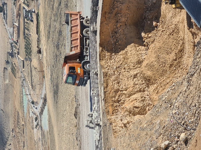 The image depicts an arid, actively developed landscape in At-Tall, Syria. In the foreground, a large, deep excavation or sinkhole with steeply eroded, sandy-loam walls dominates the lower half of the frame. Debris, including rocks and discarded materials such as plastic and metal wires, is present along the slopes and at the base of the excavation. A yellow piece of construction equipment, possibly part of an excavator or bulldozer, and a rectangular solar panel are partially visible in the lower right corner, adjacent to the excavation. Immediately behind the excavation, an orange six-axle dump truck with an empty bed is positioned on a flat, unpaved surface. Stacks of gray cinder blocks are arranged on the ground between the truck and the edge of the excavation. The ground in this midground area is light brown and appears disturbed. The background reveals a barren, undulating landscape traversed by a winding paved road. Scattered sparse green vegetation, possibly olive groves, is visible in some sections. Multiple distant, low-rise buildings or structures are dispersed along the road and across the landscape. To the left of the road, two light blue-green bodies of water, possibly retention ponds or industrial pools, are visible. The scene is set under a clear sky with distant hills forming the horizon. No individuals are explicitly discernible within the frame.