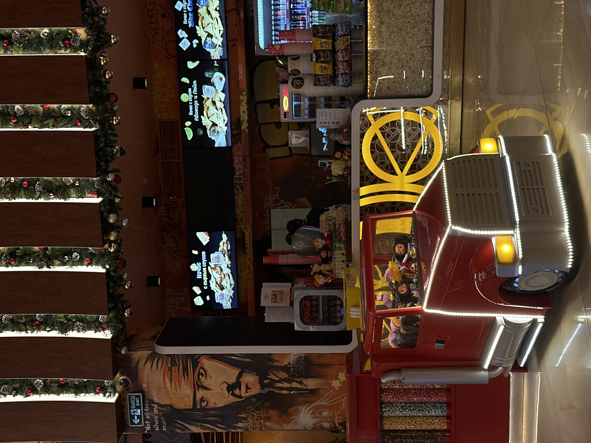 Here is a description of the image: The image shows the interior of a building, likely a cinema or entertainment complex, possibly in Rostov-on-Don, Russia. The scene includes a decorated staircase with Christmas-style greenery and ornaments on the left side. The wall to the right features a large mural of what appears to be a pirate figure, with text alongside it reading "'Not all treasure's silver and gold, mate.'" There are also digital screens displaying images of food, specifically nachos with different sauces, and text in Russian. A vending/candy stand is prominently featured, shaped like a red truck with white lights around its edges. The truck cab is filled with dolls, and the back appears to hold various candies or snacks. There's a Coca-Cola refrigerator unit visible, as well as a popcorn machine/display. The background has other graphics and designs on the wall, including a circular emblem in gold and additional text and decorations.
