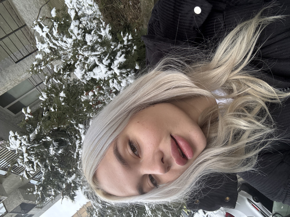 The image depicts a close-up, chest-up selfie of a female individual with long, platinum blonde hair, light brown eyes, and full, pink-toned lips