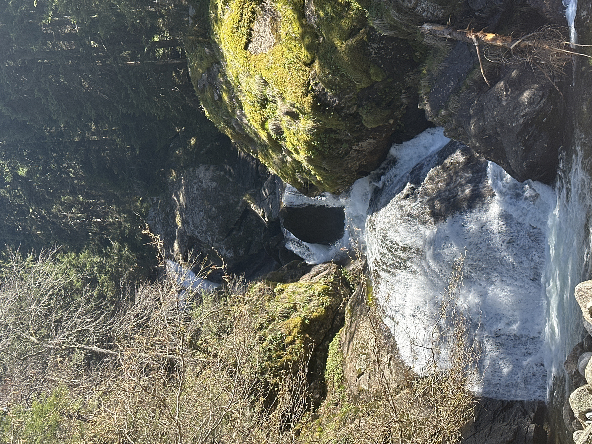 The image depicts a waterfall cascading over moss-covered rocks in a forested area. Water flows forcefully, creating a white froth as it descends. A large, mossy boulder sits prominently at the top of the falls. Bare-branched trees are in the foreground, and evergreen trees are in the background. While this scene resembles natural features found near Bistritsa, Bulgaria, it cannot be confirmed definitively as being located there without additional information.