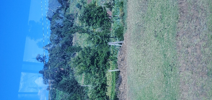 The image displays a rural landscape in Naivasha East ward, Kenya, observed through a window exhibiting reflections. The foreground consists of sparse green grass mixed with patches of exposed soil. In the midground, a rudimentary fence constructed from wooden posts and wire or rope demarcates the grassy area from an agricultural plot. Behind this fence, a dark pile of organic matter or soil is visible. Beyond the fence, several rows of green crops, possibly maize or other vegetables, are under cultivation, interspersed with various green deciduous trees. The background features a densely forested hillside covered in numerous trees, rising against a clear blue sky. Faint horizontal lines, possibly power lines or further reflections, are visible across the upper portion of the forested background. No individuals, animals, or specific actions are depicted.