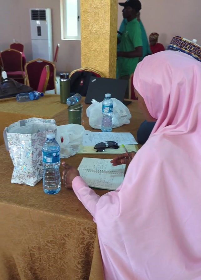 group of people, predominantly women wearing hijabs of various colors, seated at tables in a meeting room. The tables are covered with either gold or red tablecloths. Each table has chairs around it, and several water bottles, notebooks, and other personal items are visible. A projector displays a presentation on the wall. There are supporting pillars and an air conditioner in the room. Some individuals are writing in notebooks, while others are looking at laptops or interacting with each other. A man in a green shirt and a baseball cap is seen standing in the background.
