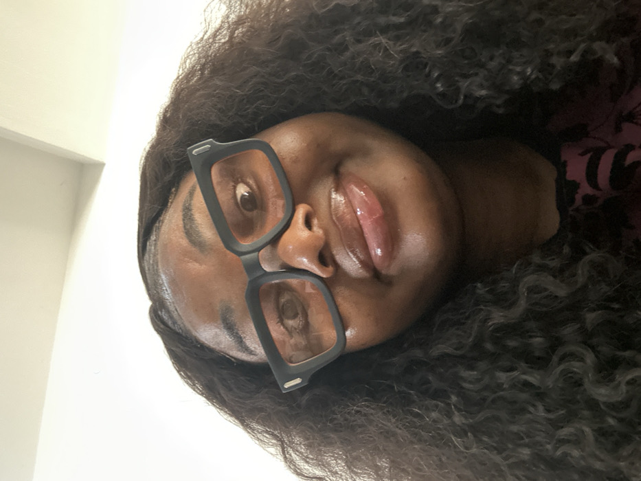 The image presents a high-angle, close-up photographic portrait of a dark-skinned female individual. Her face occupies the majority of the frame, captured from slightly below eye level. She is wearing large, thick-framed black eyeglasses. Her eyes are wide open and directed towards the camera. Her lips are visible, appearing glossy and slightly pursed. Her dark, curly hair frames her face and extends downwards on both sides. A segment of her attire, dark in color with a subtle pattern (possibly maroon with black floral or abstract designs), is visible in the lower right corner. The background is an indistinct, brightly lit white surface, characteristic of an indoor setting, likely a ceiling or upper wall. There are no discernible architectural features or environmental cues to identify a specific location within Abuja, Nigeria. The individual's action involves directly engaging with the camera for the photograph.