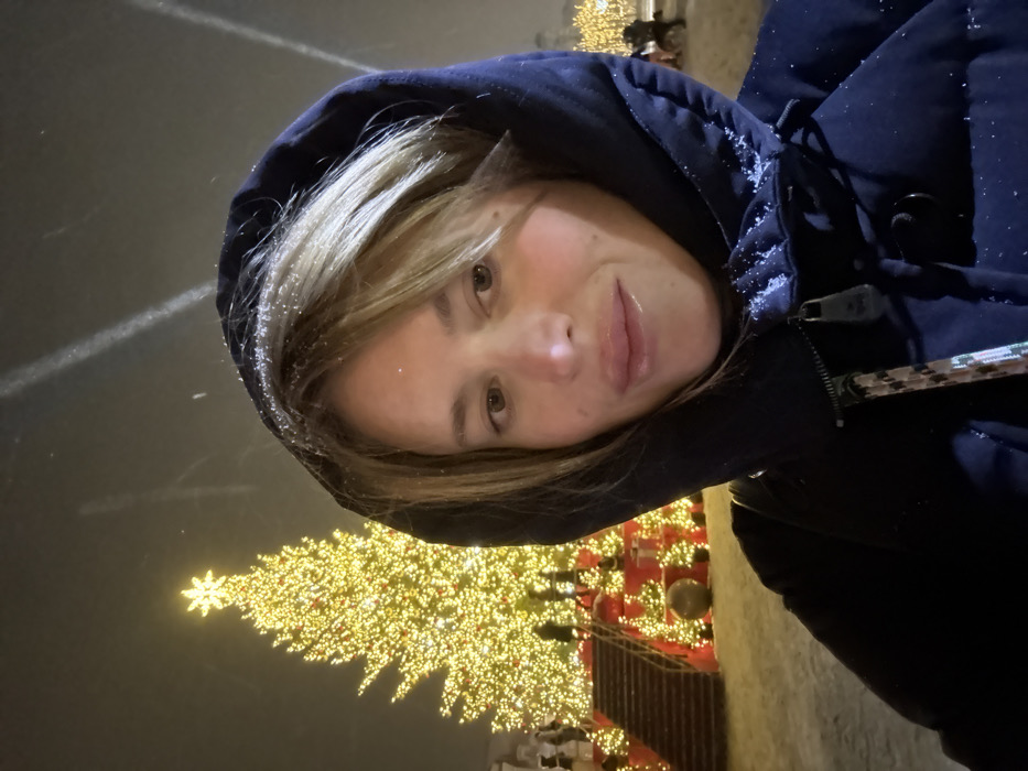 - "A woman with blonde hair wearing a dark hooded jacket poses in front of a brightly lit Christmas tree" by FM-yjK1X2, licensed under CC BY 4.0