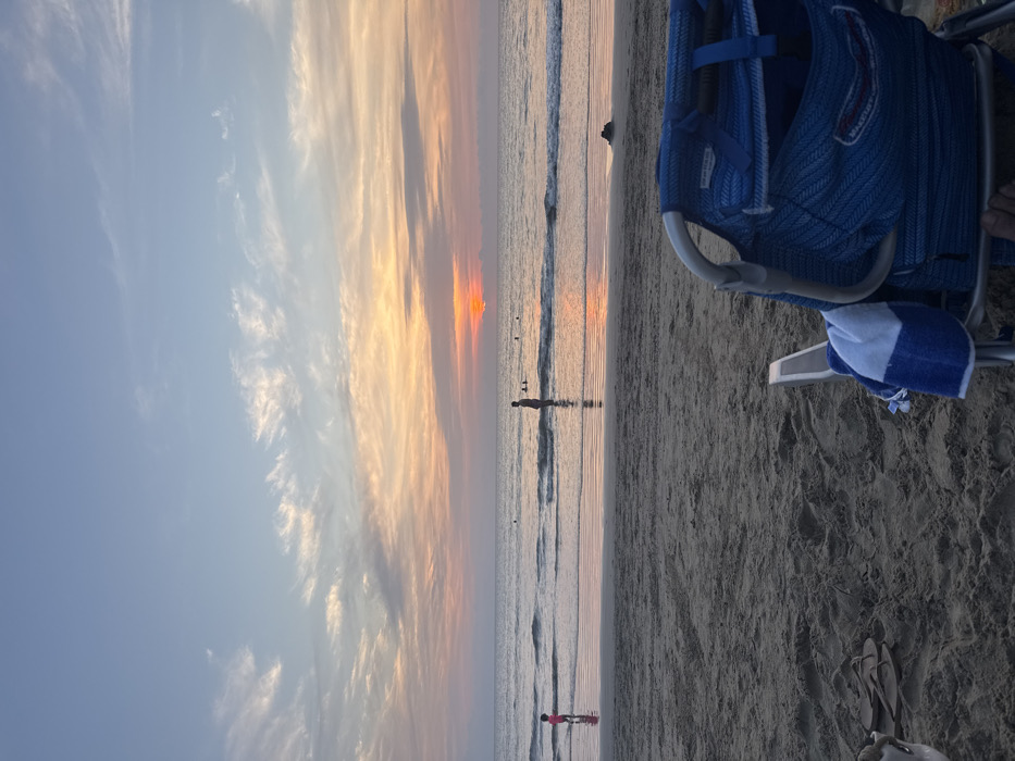 A beach scene features a vibrant sunset casting orange hues over the sky and reflecting on the water. Several people are visible wading in the shallows. In the foreground, a blue beach chair sits on the sand, accompanied by a blue and white striped towel and a pair of flip-flops. The sky transitions from light blue to warm shades, indicating the end of the day.