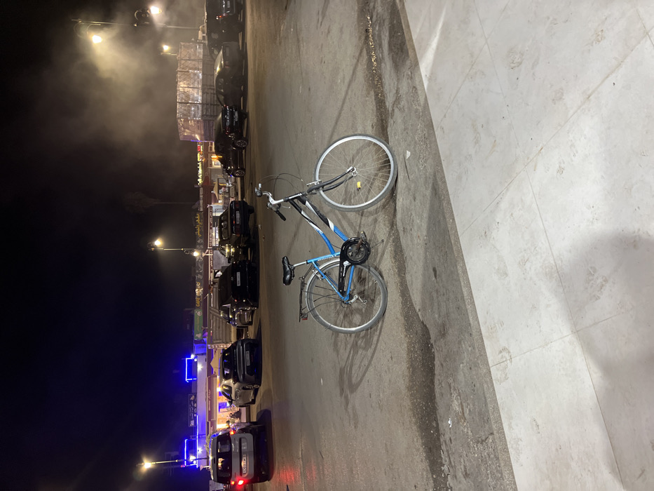 A blue and silver bicycle lies on its side on a paved surface. Behind it is a street lined with parked cars and buildings illuminated at night. Streetlights cast a hazy glow over the scene. The ground transitions from a dark, textured surface near the bike to a lighter, tiled area. The image is rotated to the side.