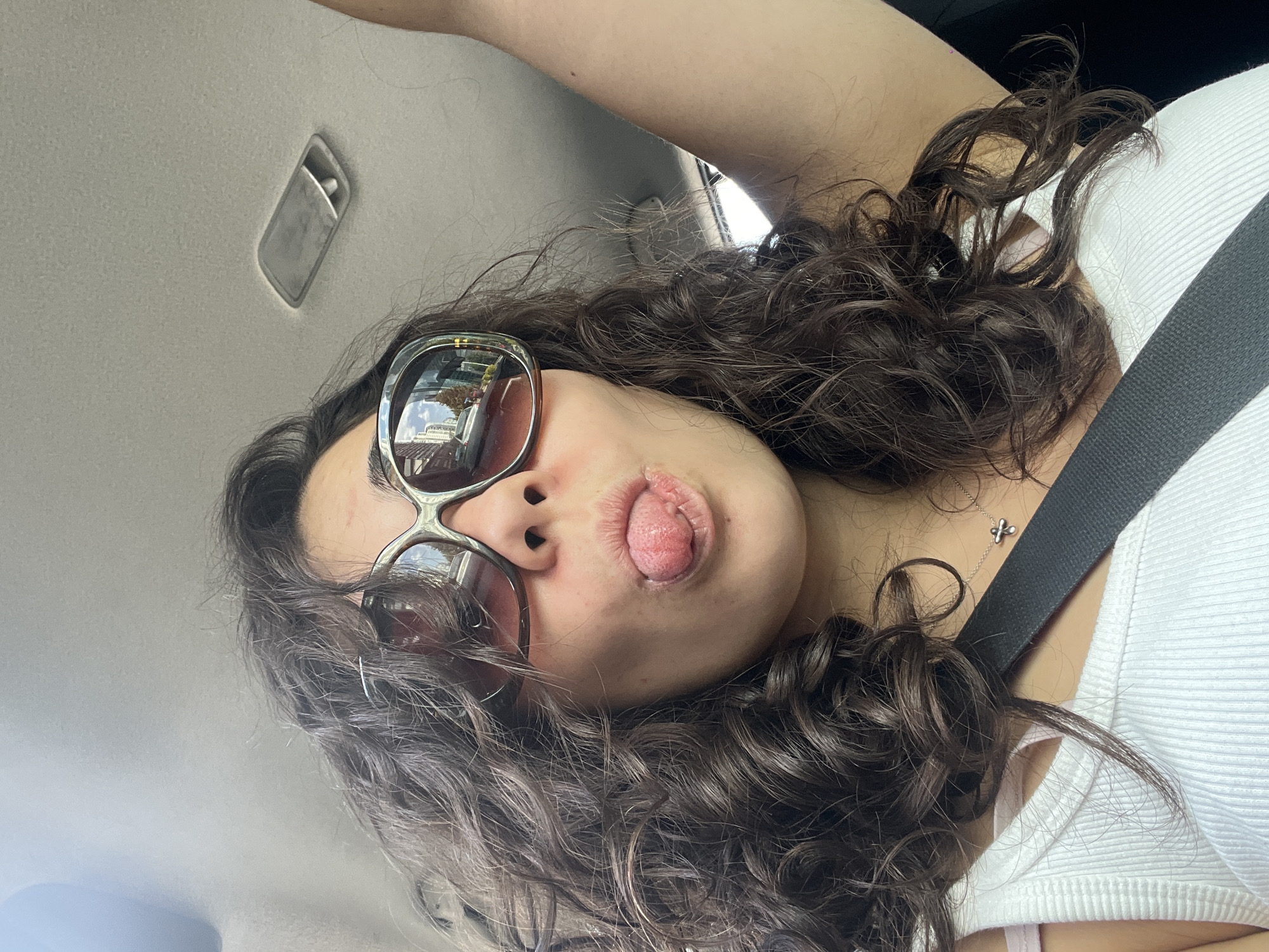 A woman is pictured inside a vehicle, likely a car, judging by the ceiling and seatbelt visible in the image. She is wearing sunglasses and sticking her tongue out. The reflection in her sunglasses appears to show buildings, potentially indicating an urban environment. Given the request, the location is identified as Mexico City, Mexico. The woman has curly hair and is wearing a white top. A necklace is also visible around her neck.