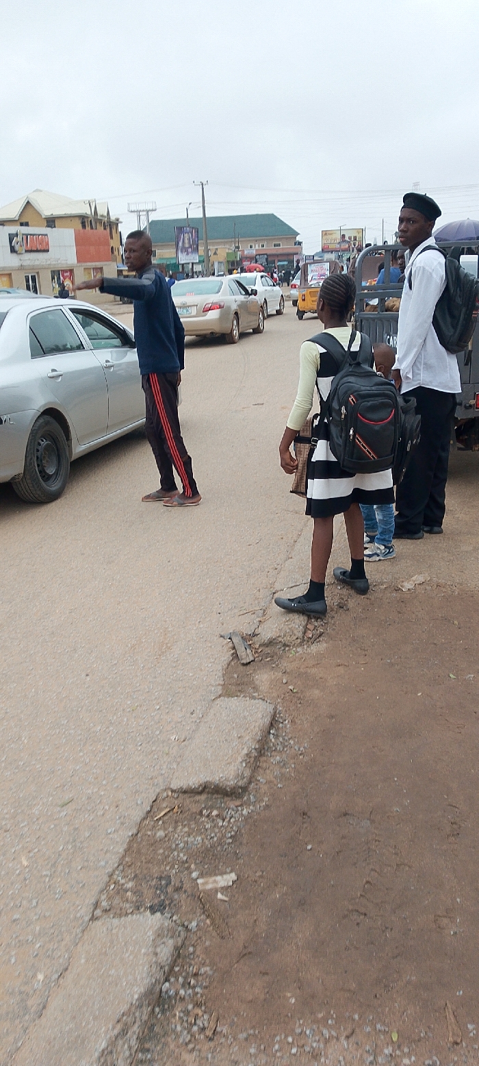 This image depicts a busy urban street scene in Kubwa, Nigeria, under an overcast sky. In the foreground, on the left, a male in a dark blue long-sleeve top with lighter shoulders and black trousers with red side stripes stands on the asphalt road, extending his right arm horizontally, appearing to direct a silver sedan to his left. The sedan has black steel wheels. To the right, on the unpaved shoulder, a young girl is visible from behind, wearing a light-colored long-sleeve top, a black and white striped dress, black socks, dark flat shoes, and a black backpack. Behind her, a taller male figure in a white long-sleeve shirt, dark trousers, and a black beret stands, also carrying a black backpack. A smaller child in blue jeans is partially visible between them. The road continues into the midground with several other cars in traffic, including a yellow motorized tricycle (Keke Napep) further down. The background features various commercial buildings, some multi-story, with visible signage and utility poles. The unpaved roadside consists of dirt and gravel, with a broken concrete curb transitioning to the asphalt road.