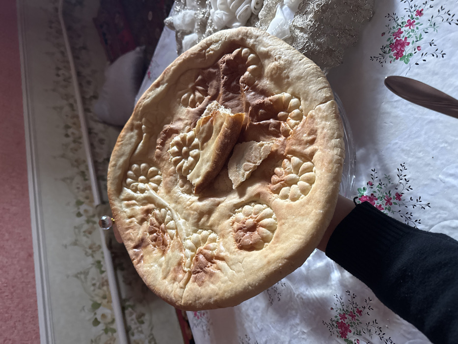 - "A close-up, indoor scene in Dehqonbozor, Uzbekistan, depicts a person's left hand holding a large, round, golden-brown flatbread from underneath" by FM-eVA3B3, licensed under CC BY 4.0