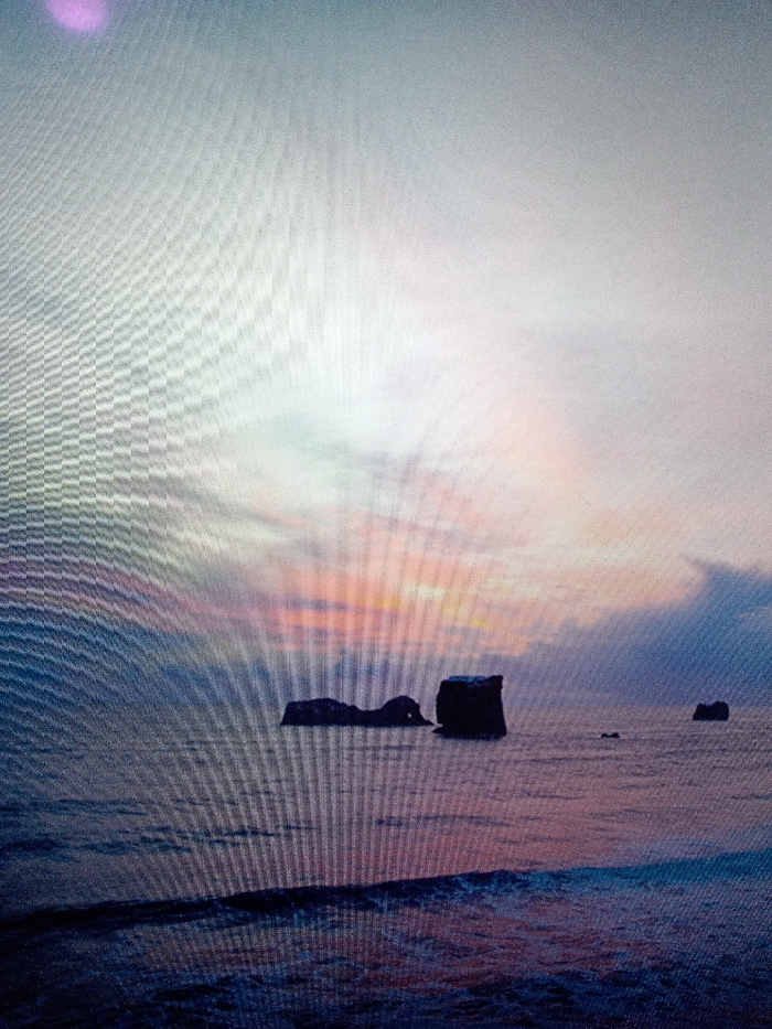 This image depicts a coastal seascape at either dawn or dusk, located at the coast of Olambe, Nigeria. The upper portion displays a sky gradient, transitioning from light gray at the top to soft blues, pinks, and oranges at the horizon. A distinct purple light anomaly is present in the upper left sky. The lower portion features dark ocean water, reflecting the sky's colors, with subtle wave patterns visible in the immediate foreground. Several dark, prominent rock formations, likely sea stacks or islets, are observed within the water: an elongated, multi-humped formation left of center, a taller, block-like formation adjacent to it on the right, and two smaller, less defined formations further in the distance towards the right. No people or specific human activities are visible within the frame. The entire image is overlaid with a uniform, distinct grid pattern, characteristic of a photograph taken of a digital display screen.