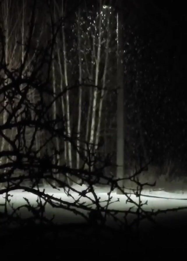 The video depicts a nighttime scene with falling snow. The foreground is mostly dark and out of focus, with a shadowy tangle of bare branches obscuring part of the view. Beyond the branches, there is a visible snow-covered ground. In the middle distance, thin, light-colored trees stand against the dark backdrop, illuminated by a street lamp located behind them. The overall scene has a stark, wintery atmosphere.