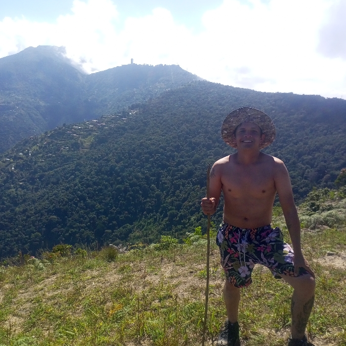 A shirtless adult male stands on a sunlit grassy slope, positioned slightly right of center, facing forward with a smile. He wears a light-colored woven hat and dark shorts featuring a multi-colored floral pattern. His left hand holds a slender wooden walking stick, resting its base on the ground. Tattoos are visible on both his lower legs. In the background, a vast, densely forested mountain range dominates the scene, sloping down into a valley and rising to another peak. Clusters of buildings, consistent with a village or settlement, are visible on an opposing mountainside, ascending the slope. A prominent light-colored tower structure and segments of a cable car system are identifiable near the summit of the highest mountain peak. The sky is bright with scattered white clouds. The scene is situated in the mountainous region near San José de Galipán, Venezuela.