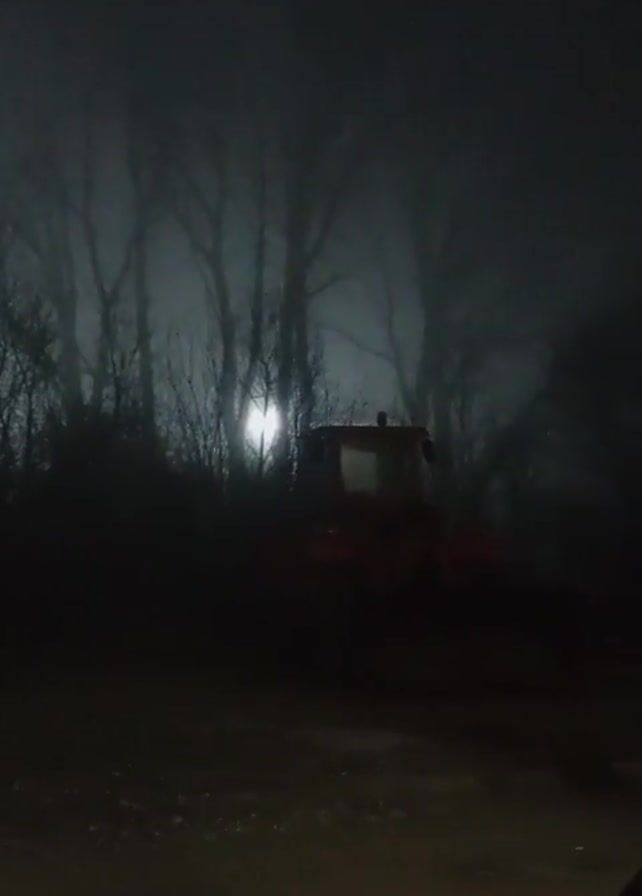 The scene appears to be set at night in a dimly lit outdoor environment, possibly a rural or wooded area. The overall atmosphere is dark and obscured by heavy fog or mist. A dark red tractor is visible in the foreground, partially obscured by trees and foliage. A bright light source, possibly the moon or a distant street lamp, shines through the trees, adding to the eerie ambiance. The ground in the foreground appears to be dirt or gravel. There are no visible people or animals.