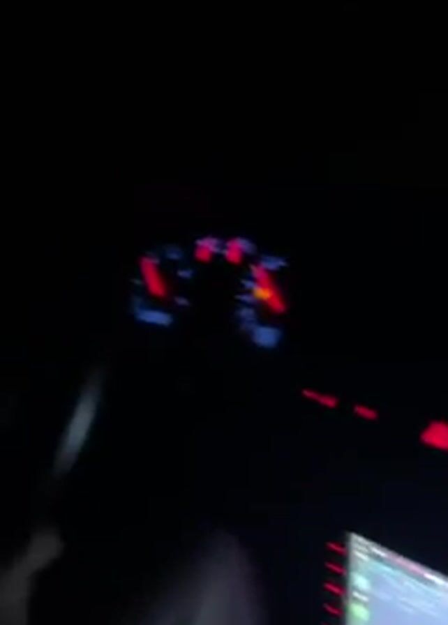 interior of a car at night. The dashboard is visible with illuminated lights and a screen displaying navigation and music. A person's face appears briefly in the frame, followed by shaky camera movement focusing on the dashboard again.